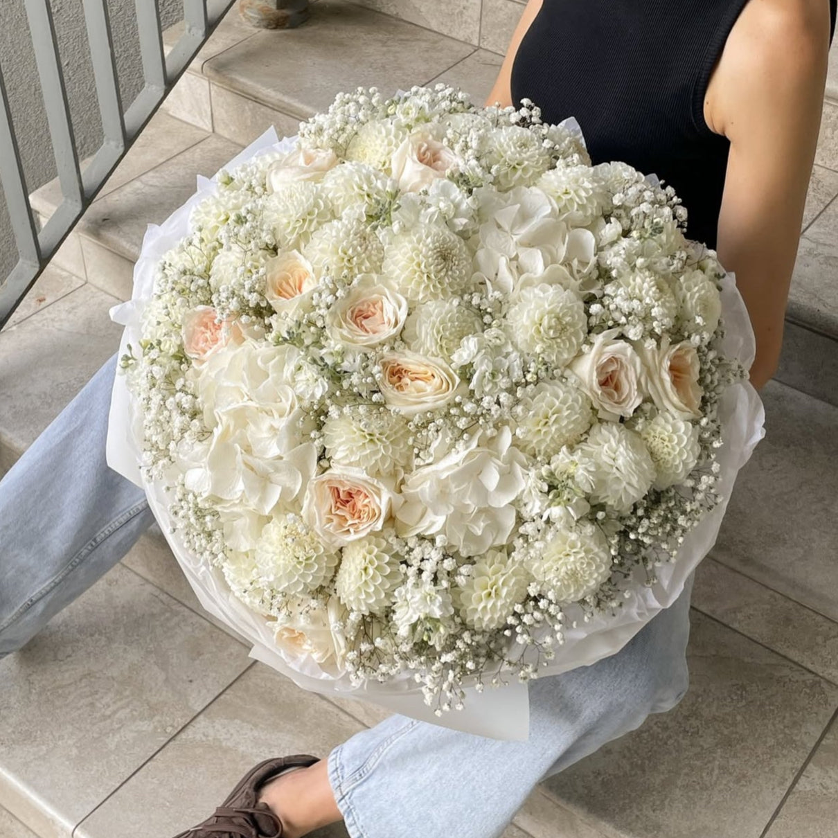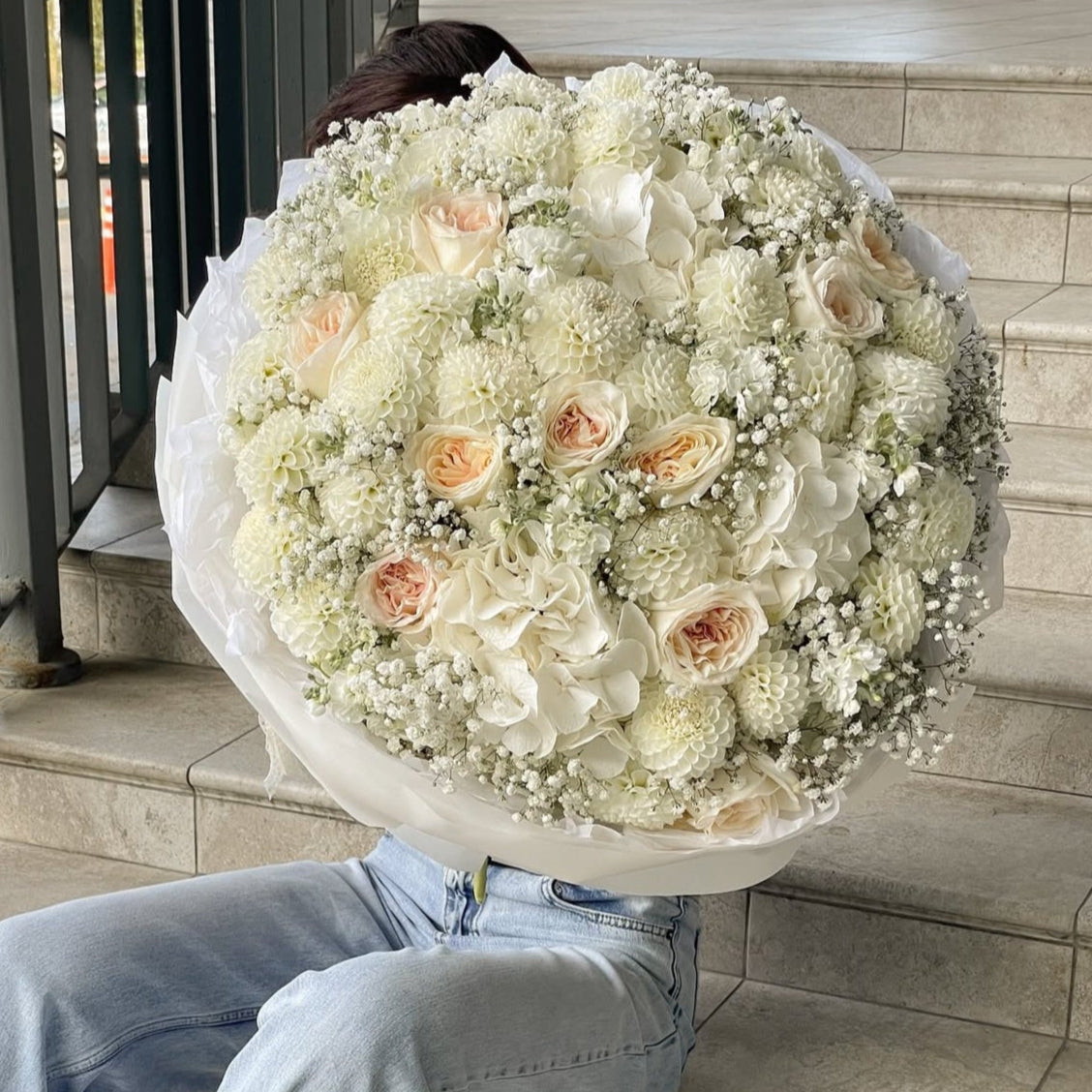 A luxurious bouquet made of fresh white and cream roses. This elegant round arrangement is designed to highlight sophistication, purity, and timeless beauty. Perfect for weddings, anniversaries, or as a romantic gift, this bouquet brings a touch of classic European style to any celebration.