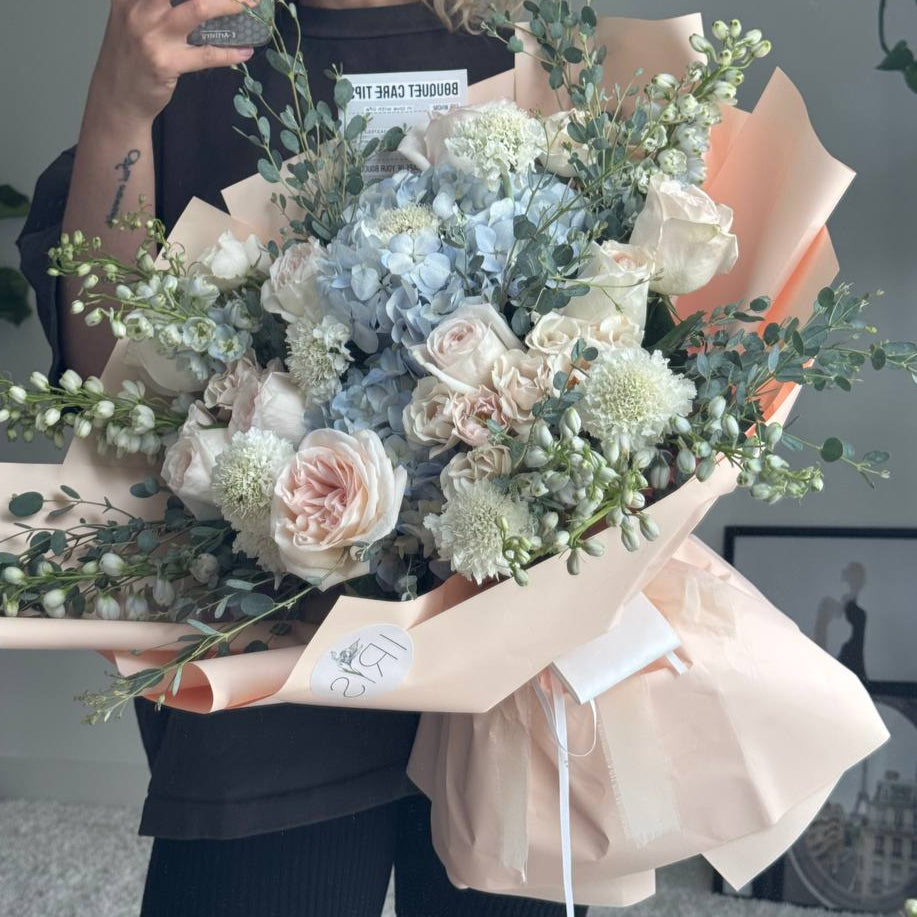 A delicate bouquet with blue hydrangeas, white roses, and seasonal flowers in soft wrapping. Elegant and fresh, it brings a feeling of lightness and sophistication. Perfect for birthdays, weddings, or as a refined gift for special occasions.