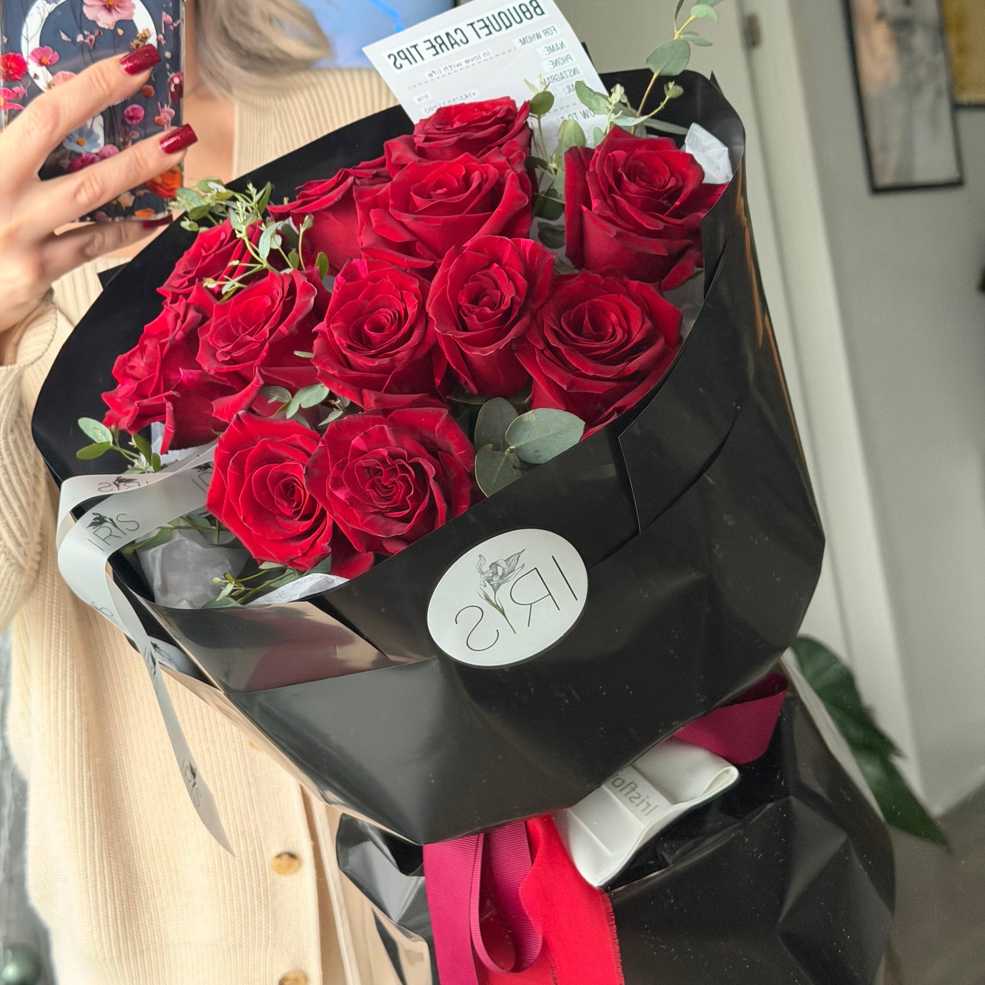 A breathtaking arrangement of rich red roses, elegantly complemented with fresh eucalyptus and wrapped in luxurious black paper. This bouquet is a timeless symbol of love, passion, and deep emotions bold, romantic, and unforgettable. Perfect for Valentine’s Day, anniversaries, or when words are not enough