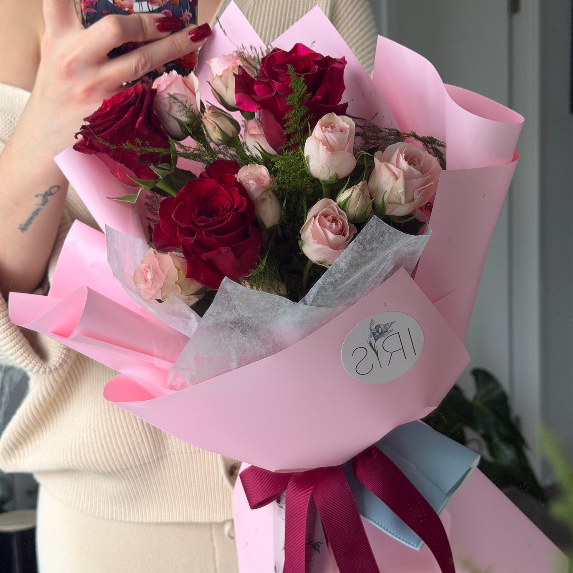 A refined arrangement of three deep red roses and three soft blush pink roses, elegantly wrapped in delicate pink paper.