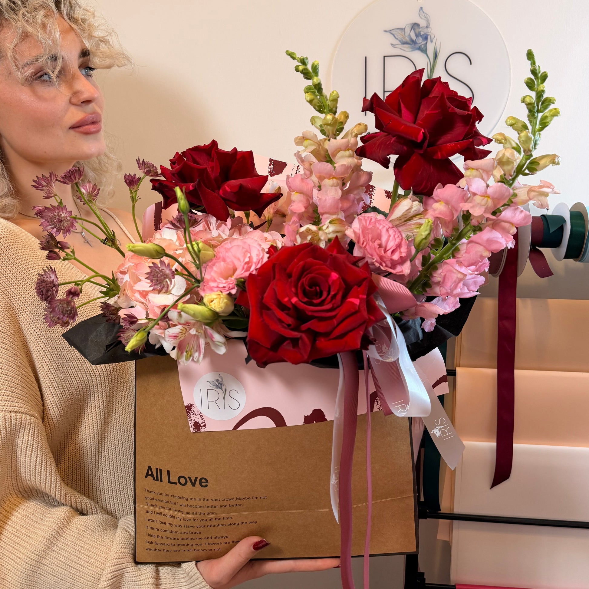 A refined arrangement of deep red roses and soft blush blooms, beautifully balanced with fresh greenery and presented in IRIS’ signature gift box. A timeless floral statement for romantic moments, celebrations, and meaningful surprises.