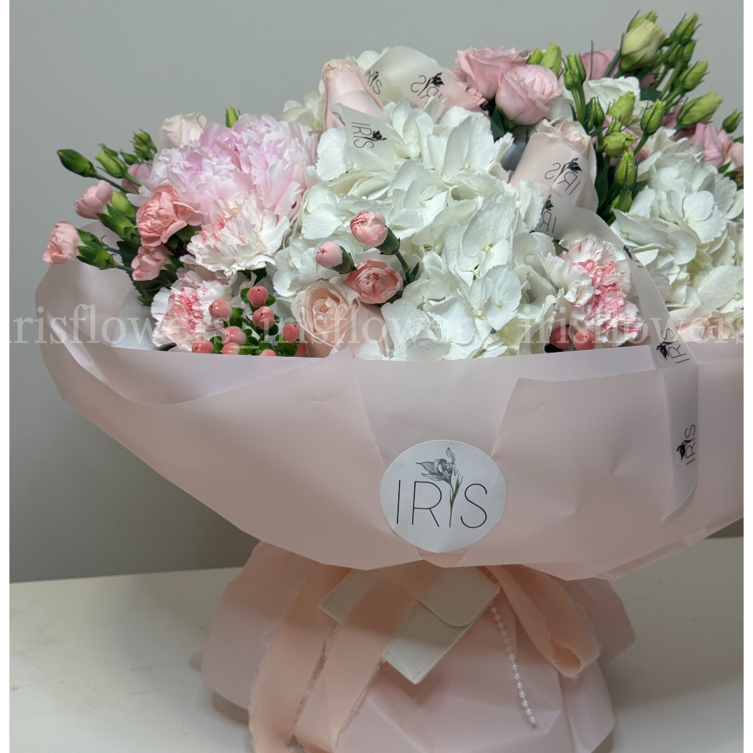 This dreamy arrangement features soft white hydrangeas, delicate lisianthus, and blush roses, all wrapped in airy pastel tones.