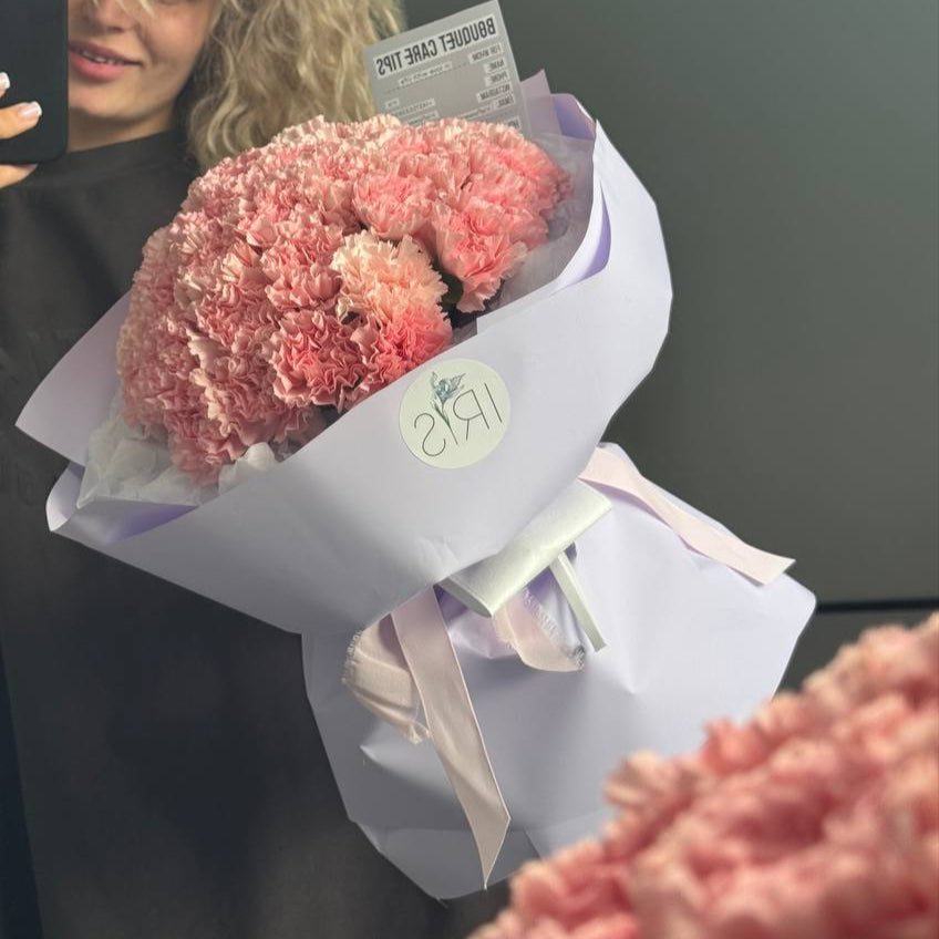 №34 is a charming bouquet composed of delicate pink carnations soft, fluffy, and full of tenderness. Wrapped in pastel lavender paper with a satin ribbon, it’s perfect for expressing gentle feelings, whether it’s love, gratitude, or just a sweet reminder of how much someone means to you.